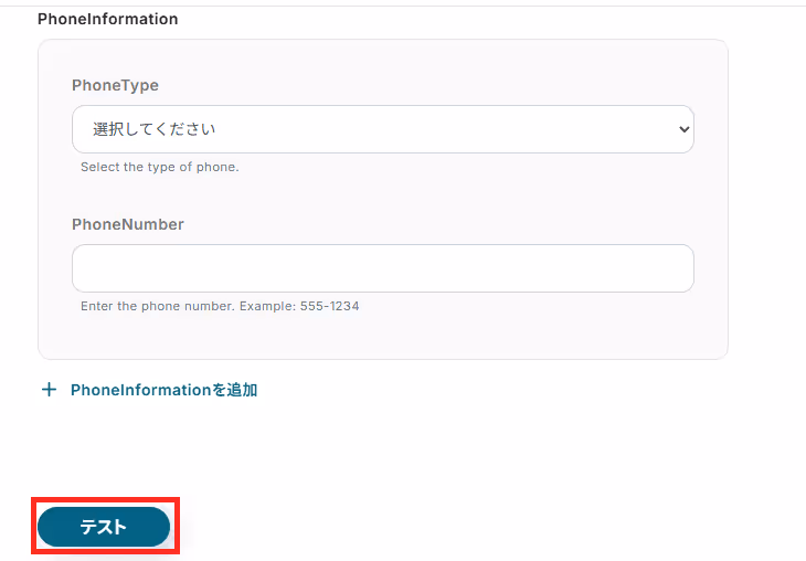 Xeroのアクション設定で基本情報はもちろん、「ContactNumber」や「AddressInformation」といった項目のご用意もありますので、連携したい内容に応じて任意で入力できます。