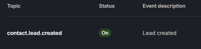 貼り付けたらその下にスクロールして、「Topics」の「Select a topic」のドロップダウンをクリックし、「contact.lead.created」を選択した状態で「Save」を押してください。以下のような状態になればOKです!