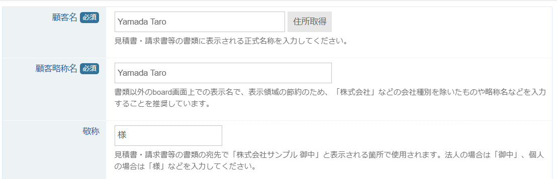 以下の例では顧客名も顧客略称名も同じ情報を入力していますが、必要であれば他の情報を入力することも可能です。