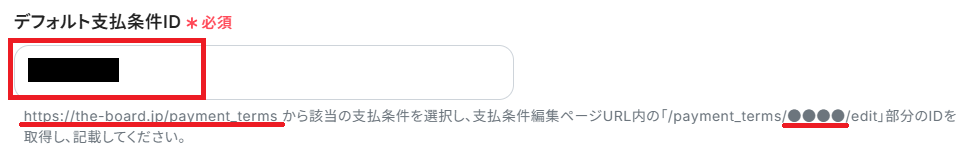 次に「デフォルト設定番号」を入力しましょう。boardにログインして、任意の「支払い条件編集」画面のURLから番号を抽出し入力してください。