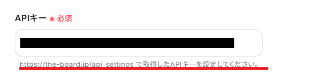 まずはマイアプリ連携の際にboardで取得したAPIキーを入力します。APIキーを紛失した、もしくはエラーが出るという方は、boardで新たにAPIキーを取得しなおして入力してください。