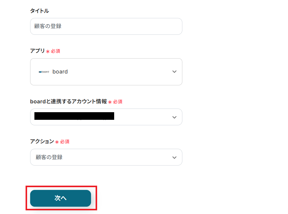 タイトルを任意で設定し、boardと連携するアカウントやアクション内容を確認したら「次へ」を押してください。