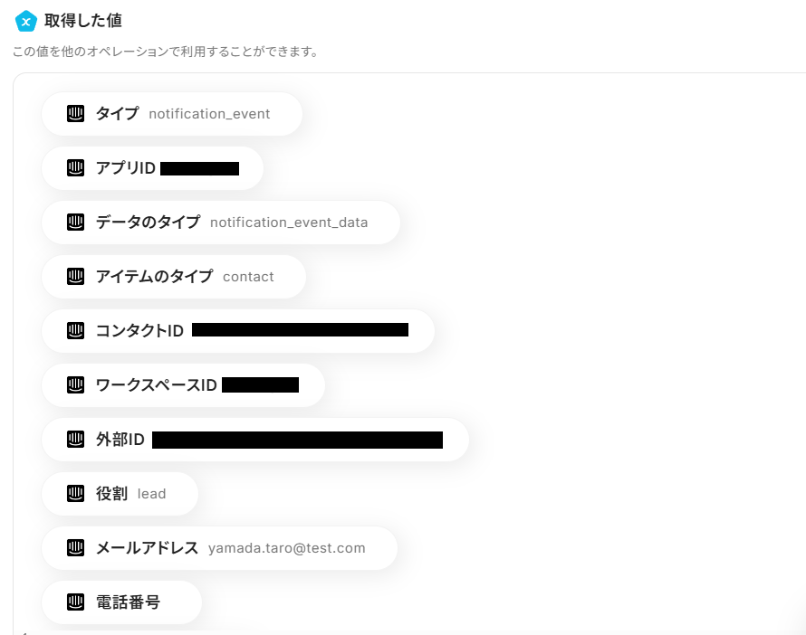 以下のように「取得した値」として、Intercom側で作成したリードコンタクトの情報が表示されれば成功です!
