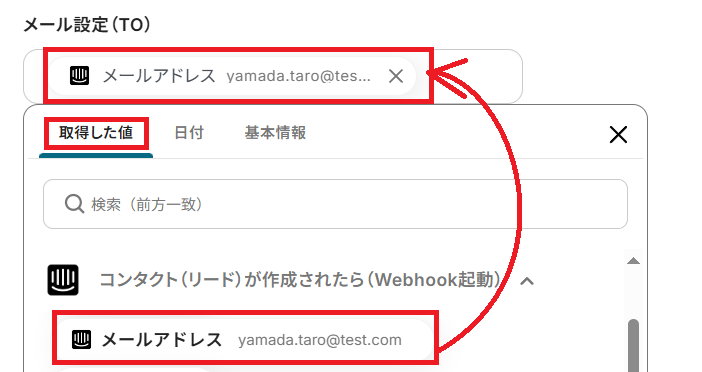 メール設定では、先ほどテストとしてメールアドレスを設定したので、試しに「メール設定(TO)」に取得した値から以下のように入力してみます。