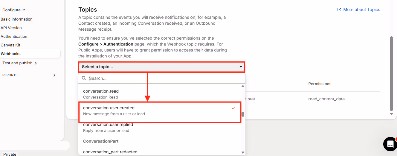 Topicsの欄にあるSelect a topicを開き、プルダウンから「contact.lead.created」を選択しましょう。