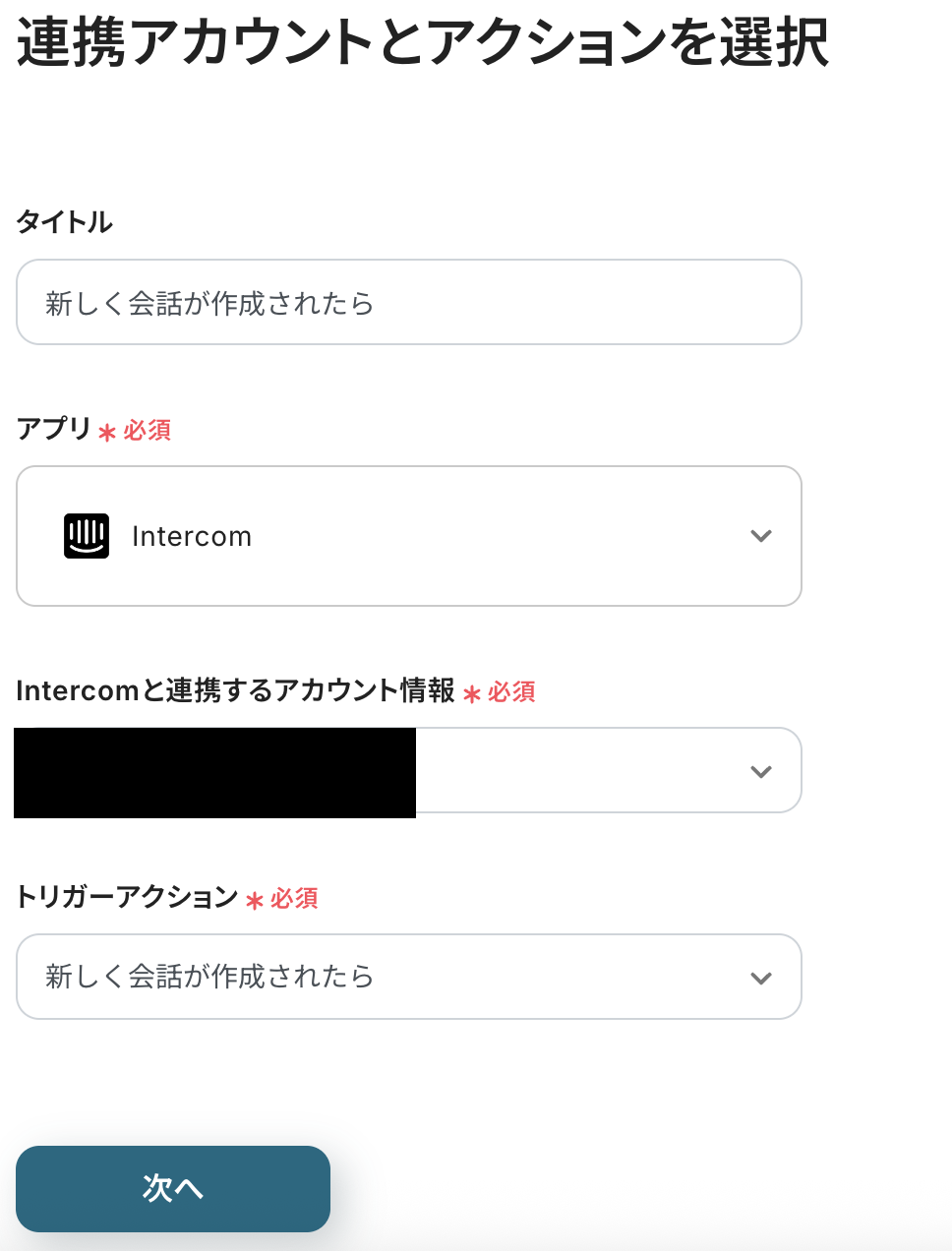 連携アカウントとアクションを選択の画面は、以下の点を確認し、次へをクリックしてください。