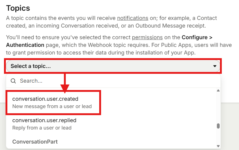 ユーザーが会話を作成したことをトリガーにするために、Topicsで「conversation.user.created」を選択してください。