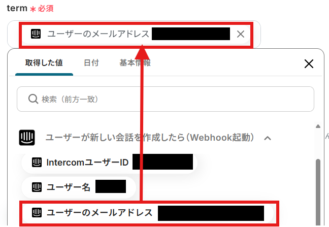 「term」に「取得した値」の「ユーザーのメールアドレス」を設定しましょう。