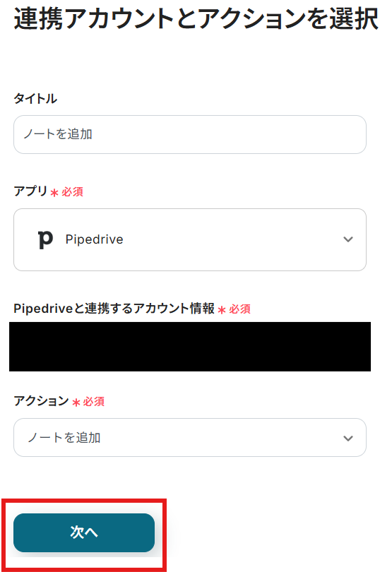タイトルと連携するアカウント情報を確認し、アクションはテンプレート通りのまま「次へ」をクリックして進んでください。