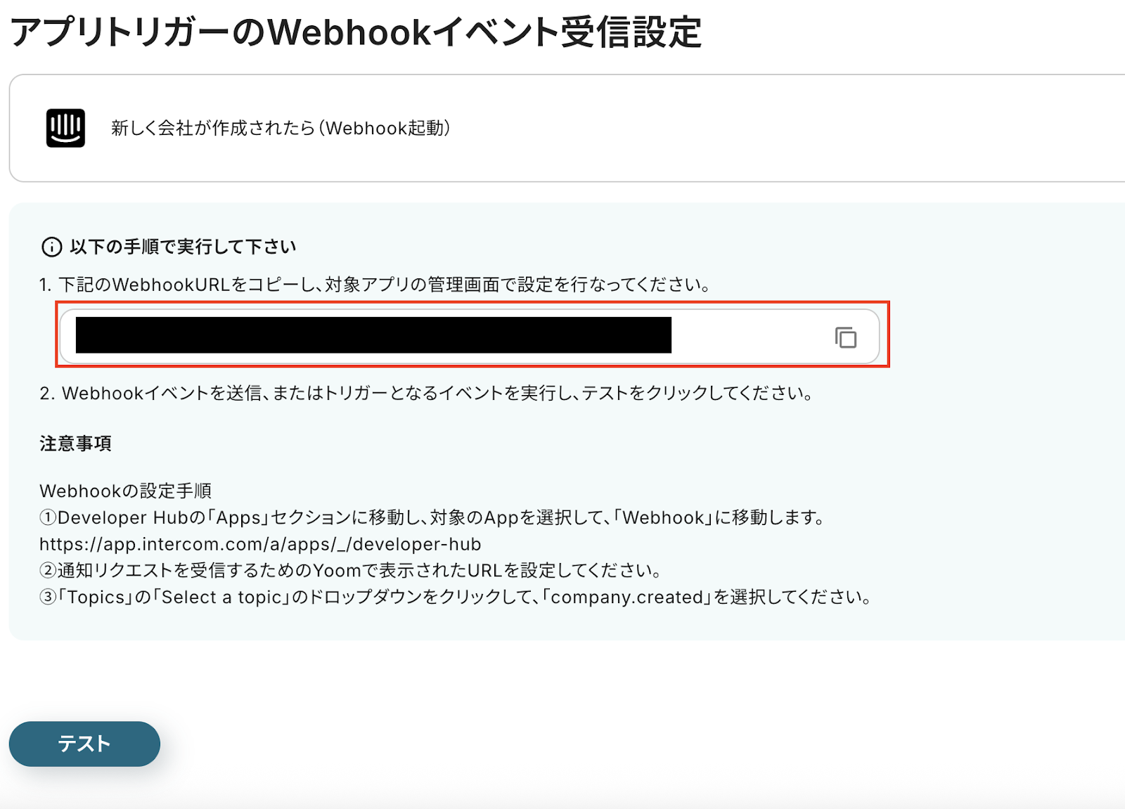 表示されているWebhookURLをコピーして、Intercomの管理画面で設定してください。