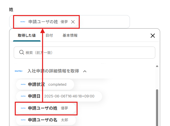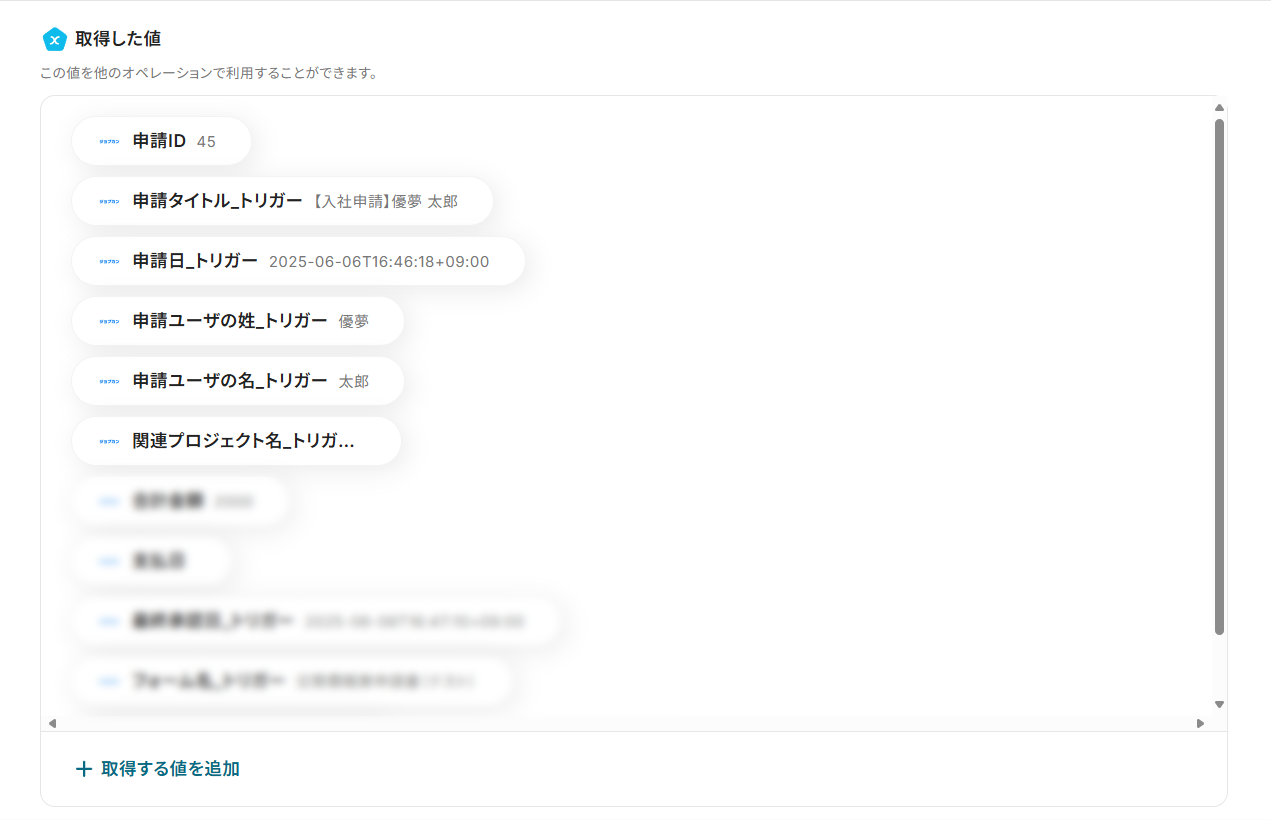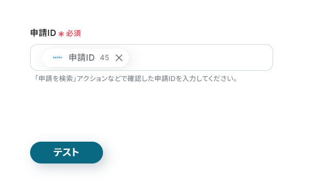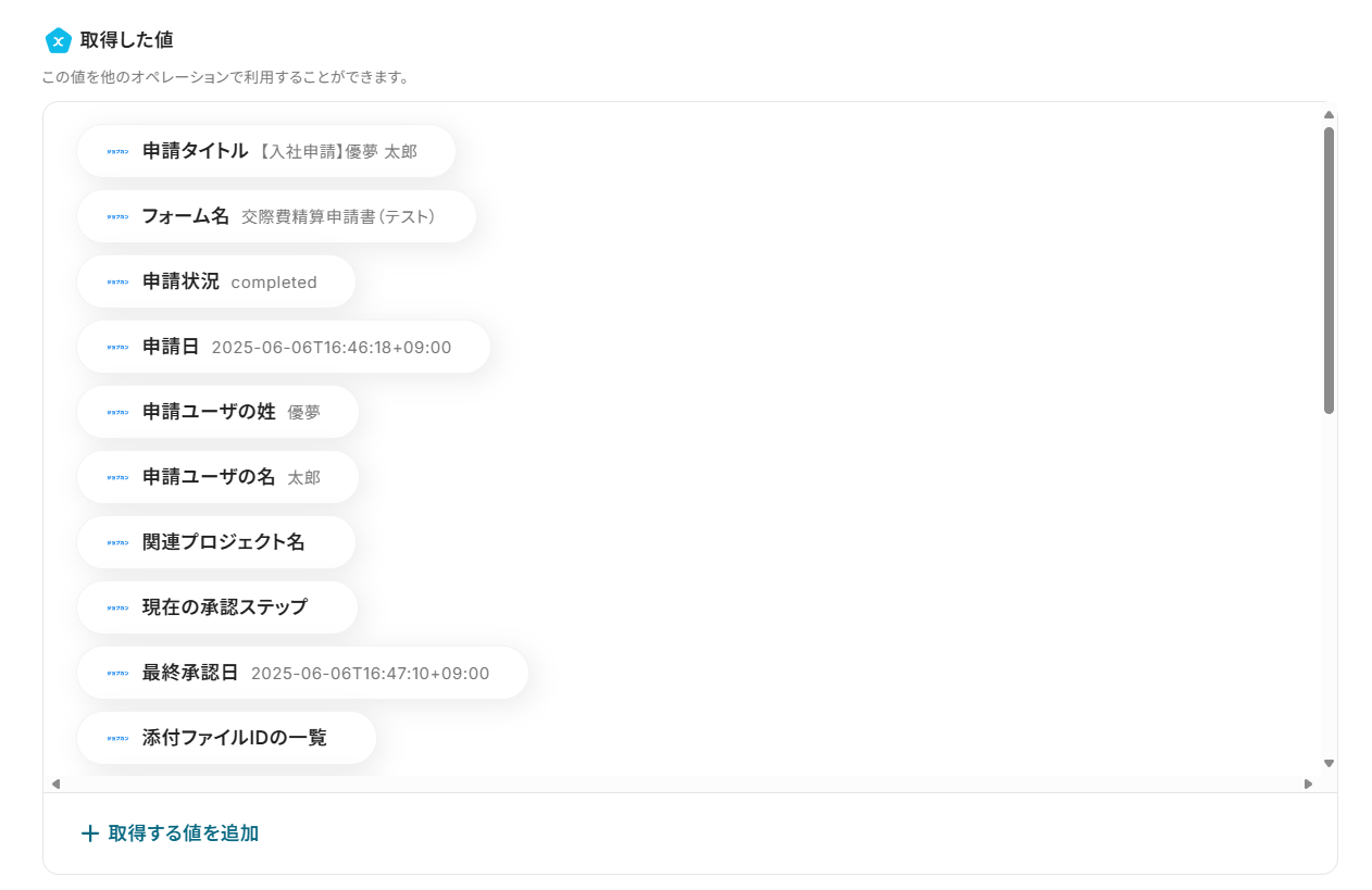 - テストが成功すると、承認日時が最も新しい申請の情報が「取得した値」に追加されます。