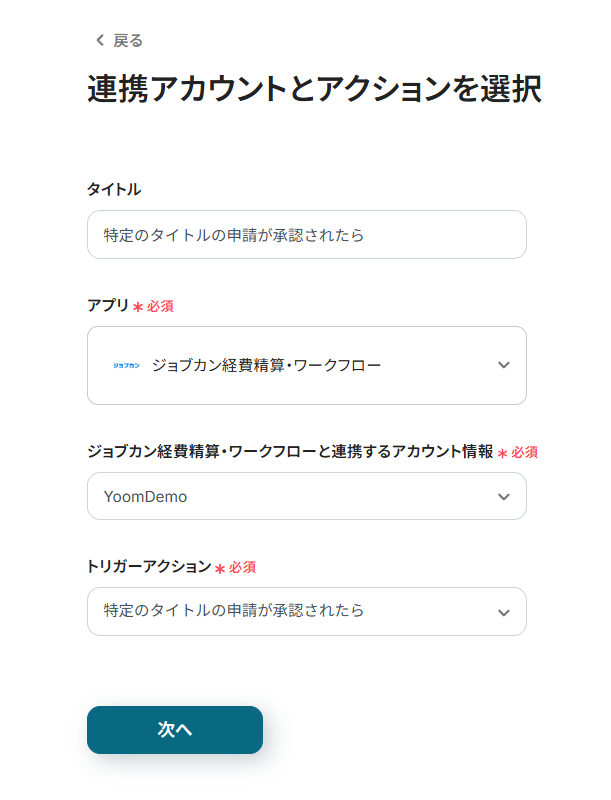 - ジョブカン経費精算・ワークフローの「特定のタイトルの申請が承認されたら」をクリック。