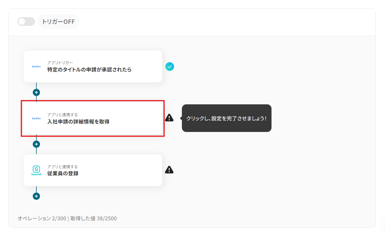 - トリガーとなる申請と各アクション(申請の取得・従業員の登録)の設定