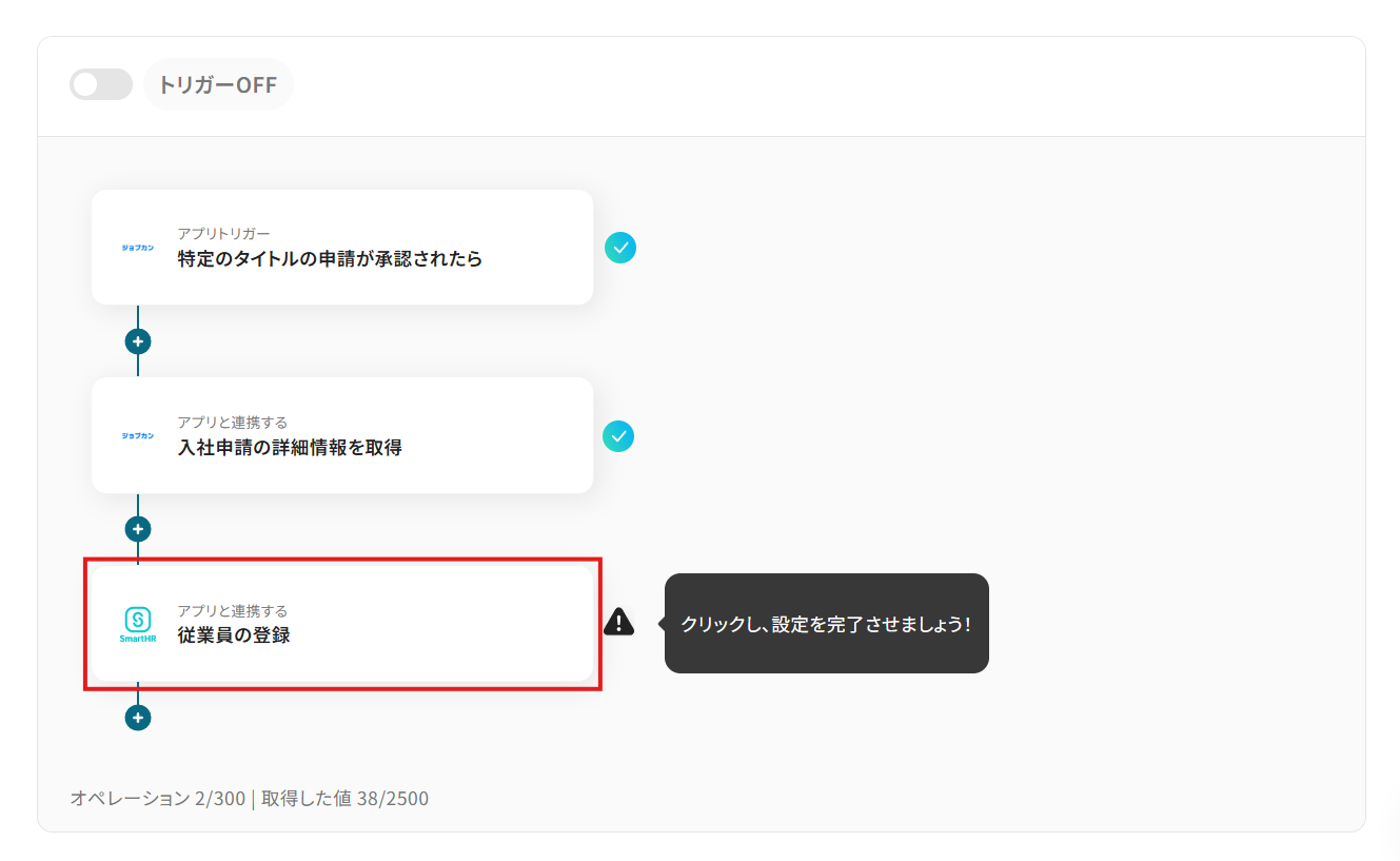 ジョブカン経費精算・ワークフローで入社申請のワークフローが承認されたら、申請項目の情報でSmartHRに従業員を登録します。