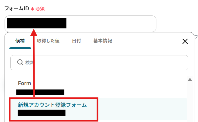 その中から、先ほどWebhookを設定したフォームを選択してください。選択すると、自動でフォームIDが自動で反映されます。
