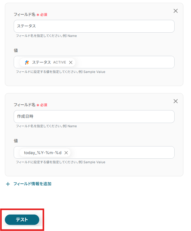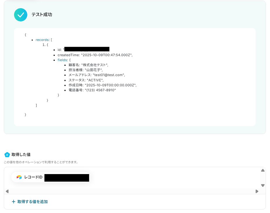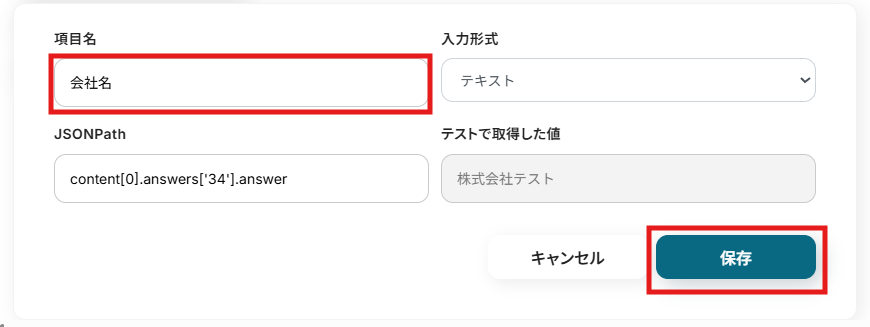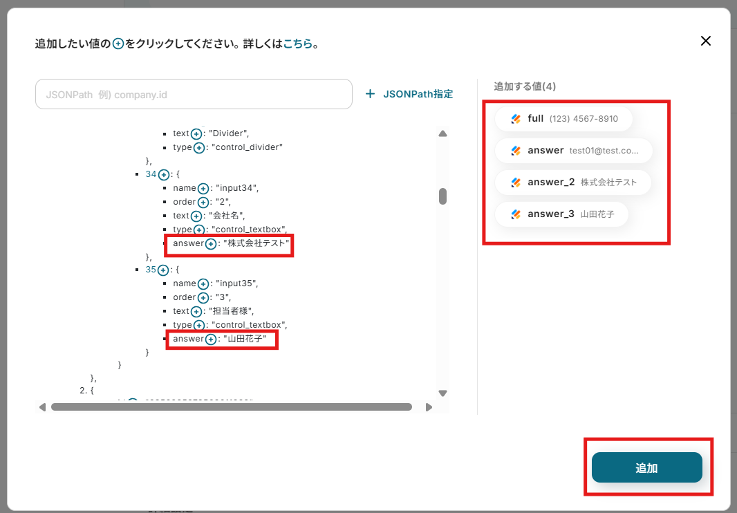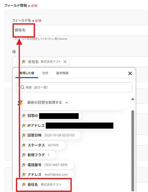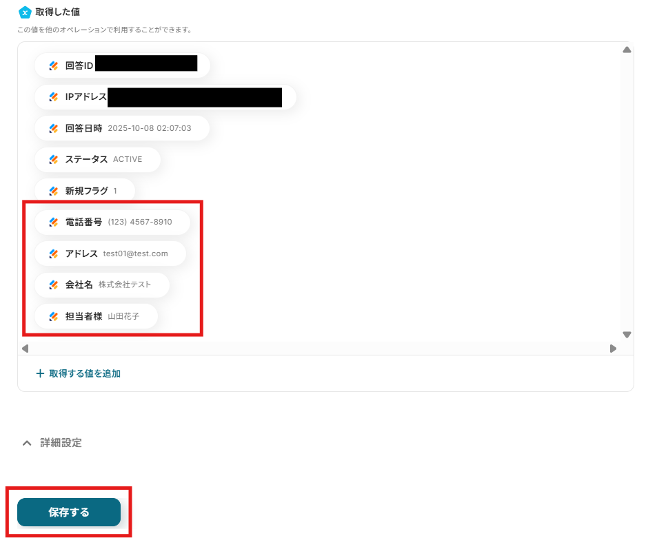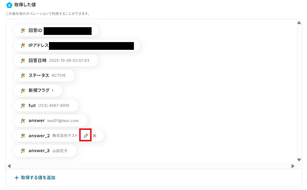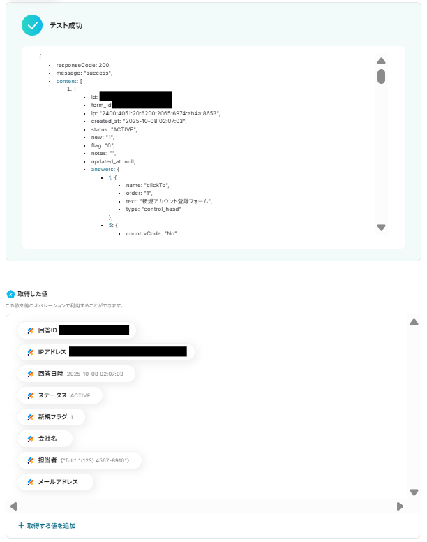 テストに成功すると取得した値の横に、Jotformに送信した回答内容が表示されます。