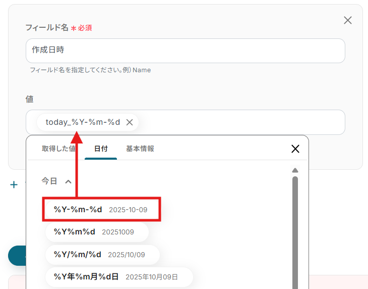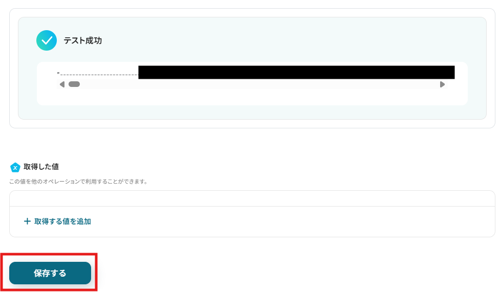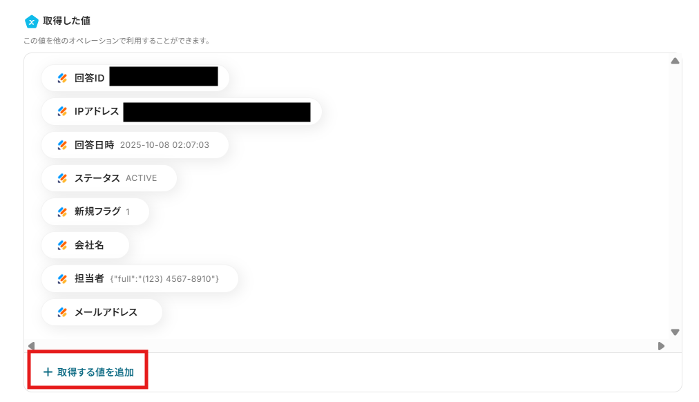 「取得する値を追加」をクリックし、取得した値を追加しましょう。