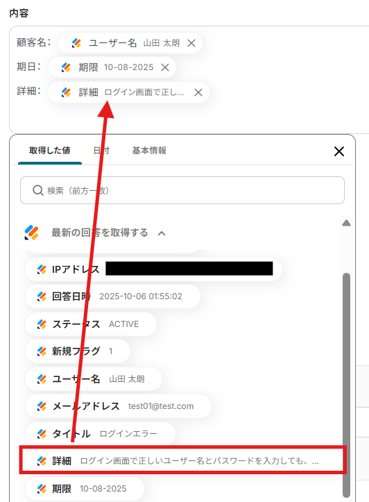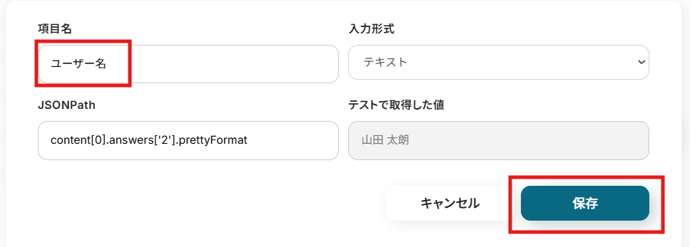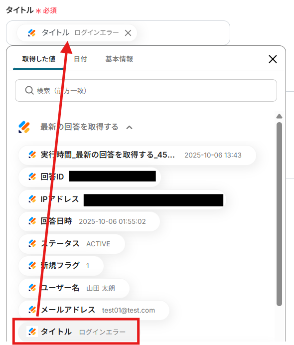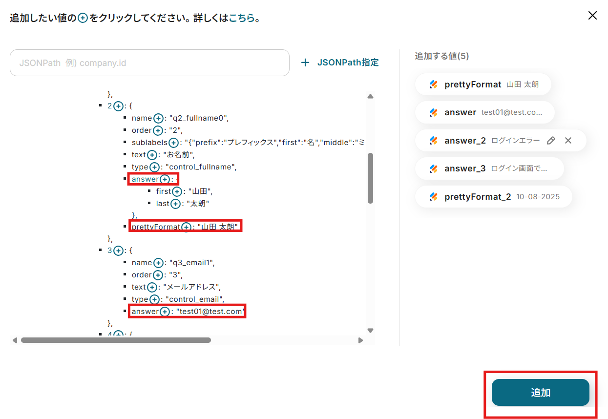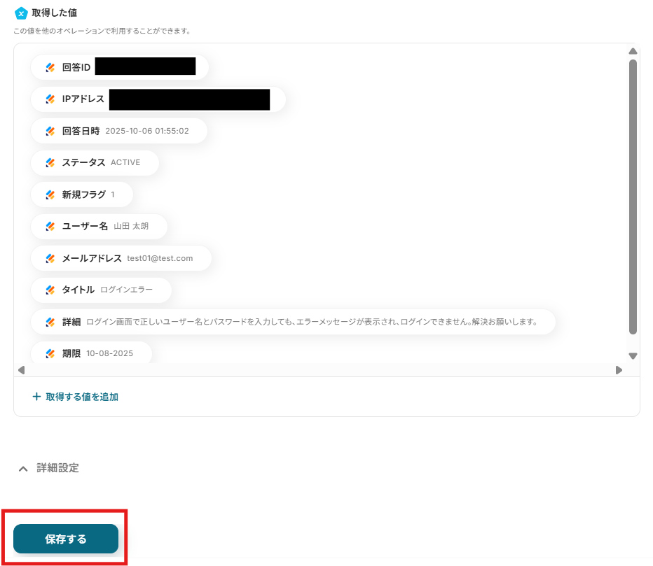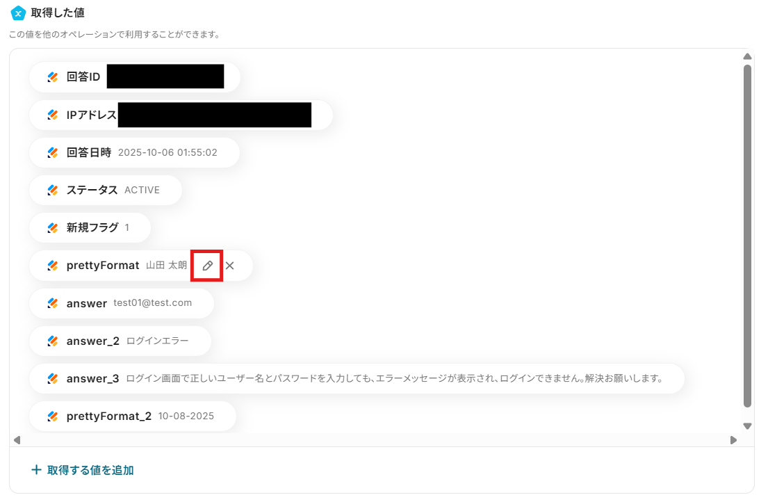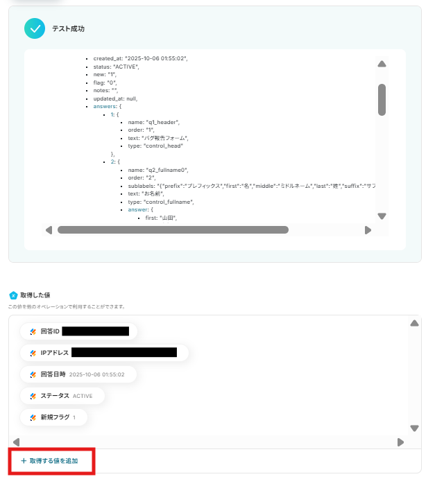 テストに成功すると取得した値の横に、Jotformでの回答内容が表示されます。