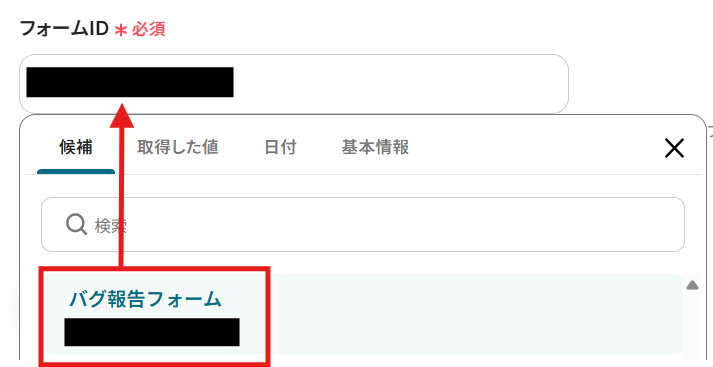 編集欄をクリックすると、連携したJotformアカウントのフォーム候補が表示されます。