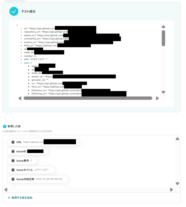 Jotformのフォームから取得した各回答項目(例:タイトル・ユーザー名・詳細・期日など)をGitHubのIssueタイトルや本文にマッピングすることが可能です。