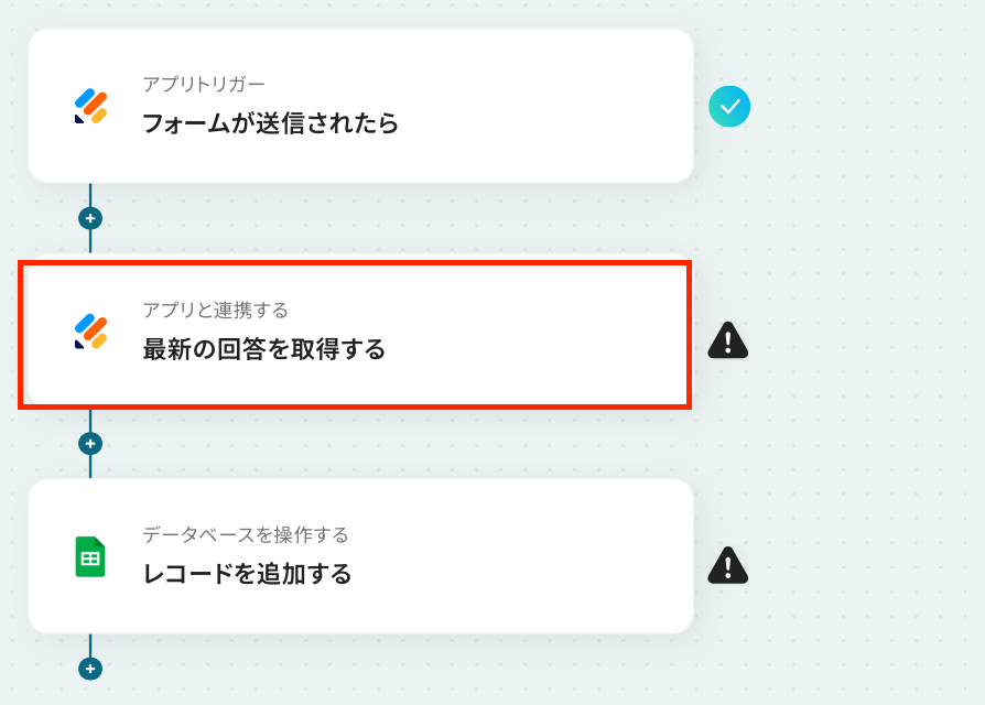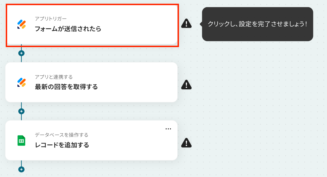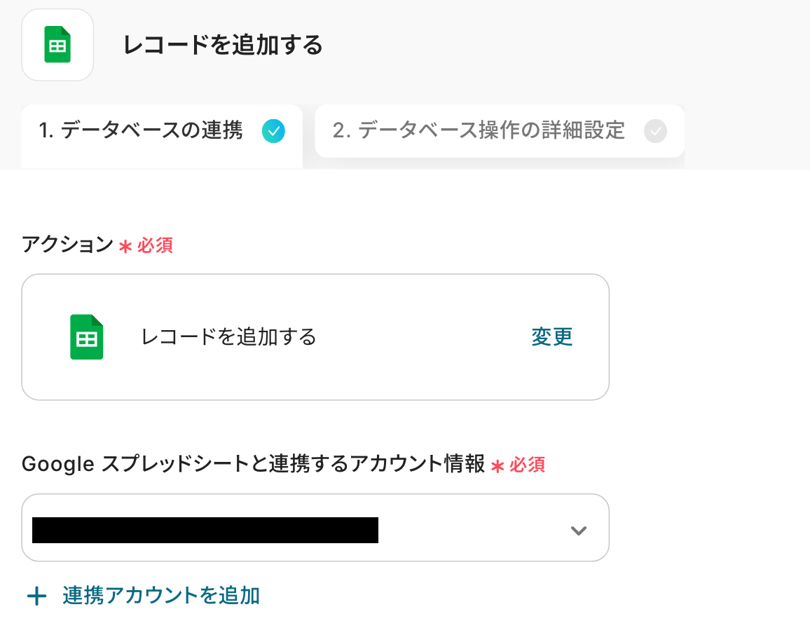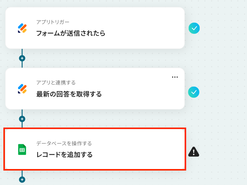 ステップ5:Googleスプレッドシートにレコードを追加する設定 最後の設定です! 指定したシートに先ほど取得した値を転記する設定を行います。 それでは、以下の赤枠をクリックしましょう!