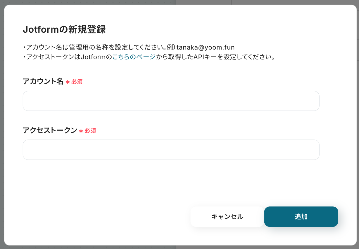 「アクセストークン」は、 以下のリンクから取得したAPIキーを設定します。 Yoomの画面に戻って設定したら「追加」をクリックしましょう。