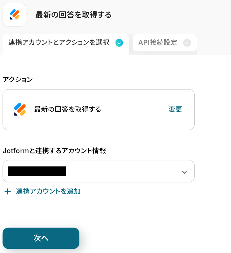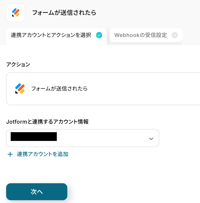 アクションはそのままで、連携するアカウント情報を確認します。 「次へ」をクリックして進みましょう!