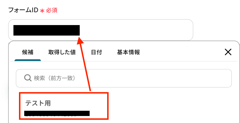 以下の画面が表示されたら、「フォームID」 を入力します。 入力欄をクリックして表示される候補から選択しましょう。 ここでは、先ほどテスト送信したフォームを選択してくださいね。