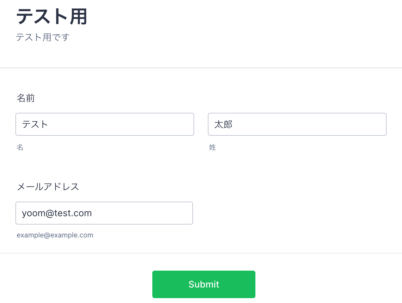 Jotformの画面で、テストで使用するフォームを用意してください。 今回は例として以下のようなフォームを使用します。 ここで実際にフォームを送信してください。