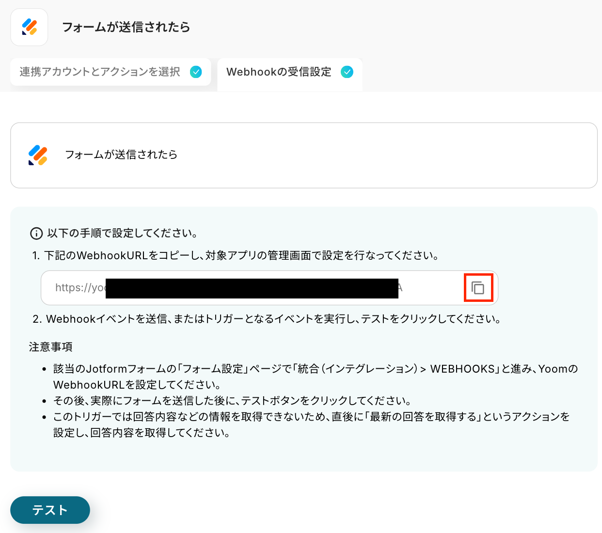 Jotform、NotionのそれぞれとYoomを連携してください。 JotformのWebhook設定方法はこちら をご参照ください。