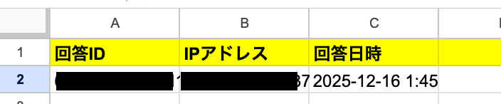 Google スプレッドシートの画面に移り、レコードが追加されているか確認をしてみましょう。追加されましたね!