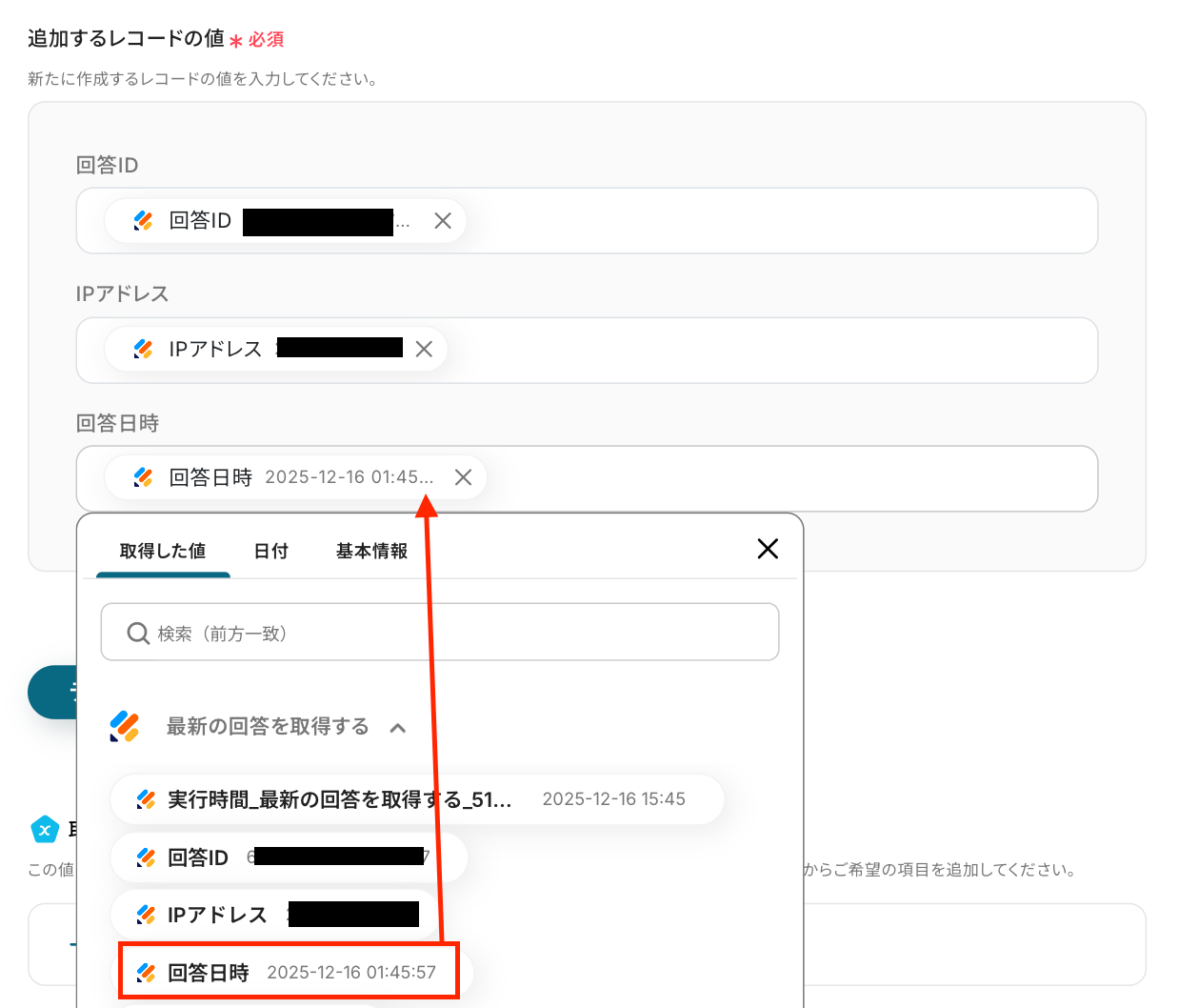 続いて、データベース操作の詳細設定画面に遷移します。 ここでは、「追加するレコードの値」 を設定しましょう。 各項目には取得した値を引用して設定してください。