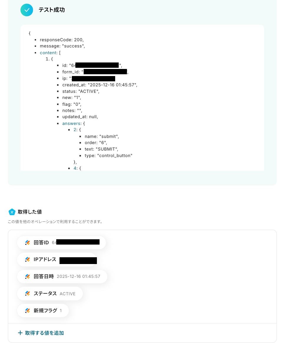 ※ 取得した値 とは? トリガーやオペレーション設定時に、「テスト」を実行して取得した値のことを指します。 後続のオペレーション設定時の値として利用でき、フローボットを起動する度に変動した値となります。