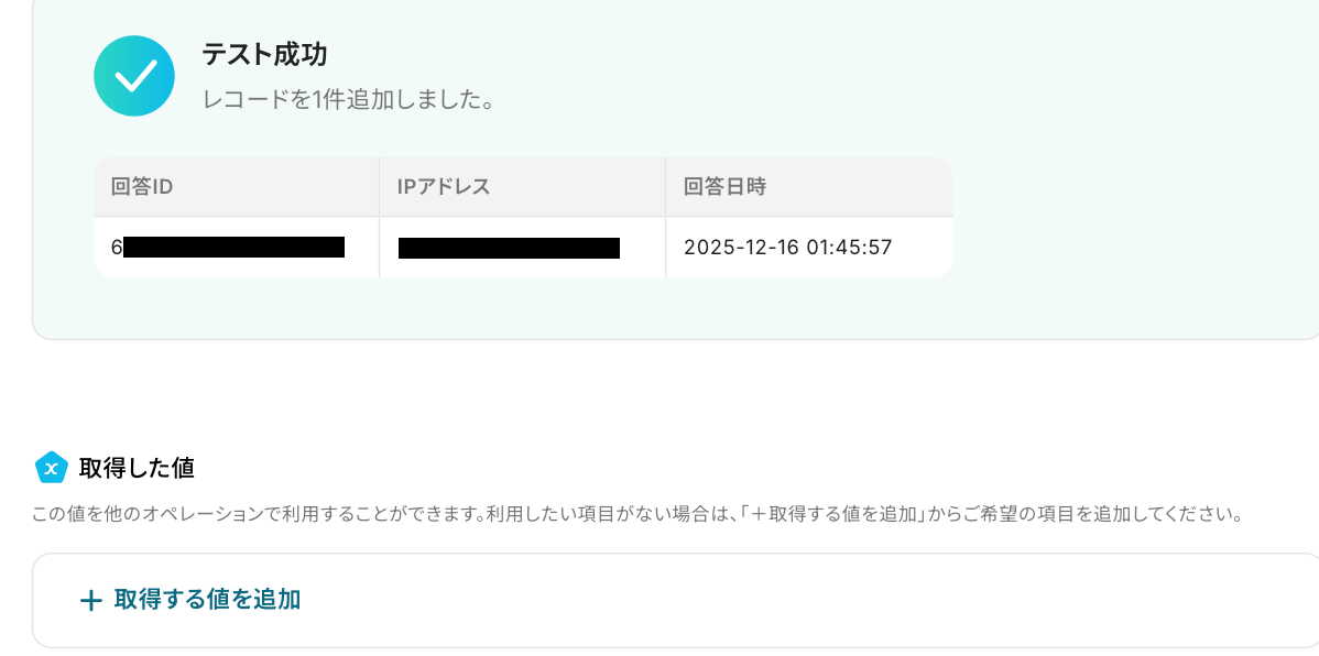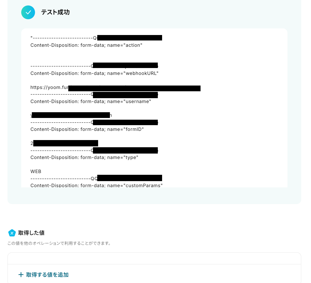 Yoomの画面で「テスト」をクリックしてください。 テストに成功すると、取得した値が表示されます。確認後、「完了」をクリックしましょう。