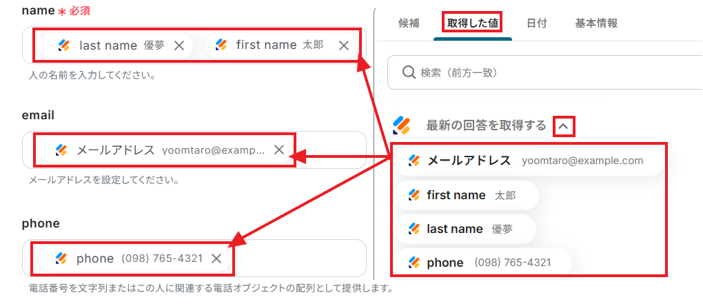 Jotformから取得した値を活用して、以下3つの項目を設定していきましょう。