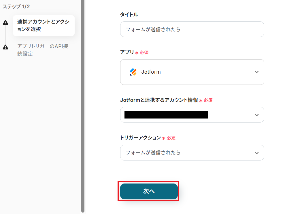 タイトルを任意で設定し、Jotformと連携するアカウントやアクション内容を確認したら「次へ」を押してください。