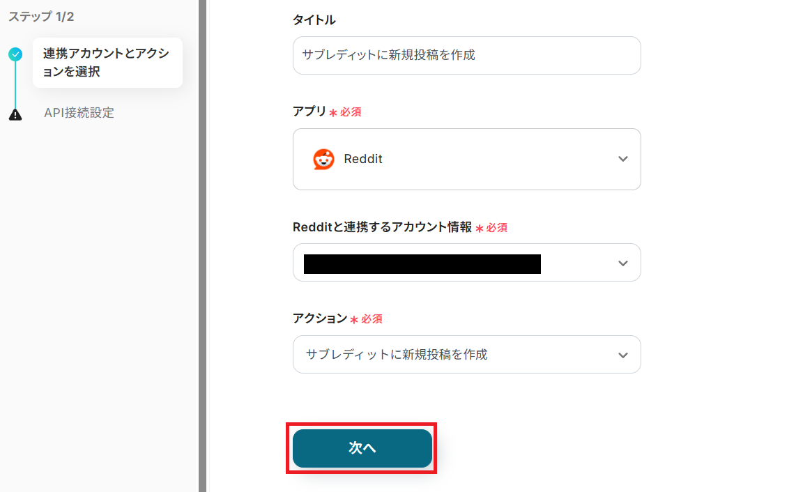 タイトルを任意で設定し、Redditと連携するアカウントやアクション内容を確認したら「次へ」を押してください。