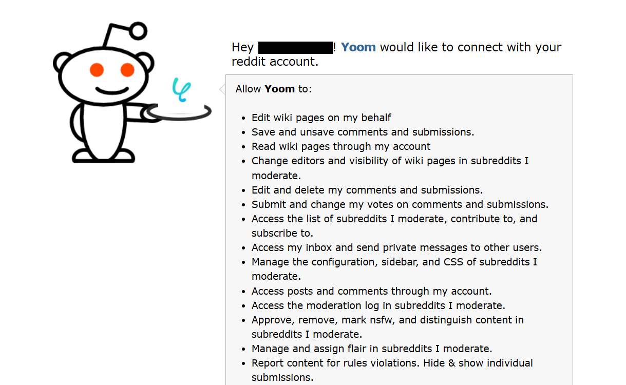 任意のRedditアカウントでログインすると、YoomがRedditに権限を求める以下のような画面が表示されます。