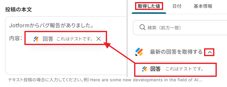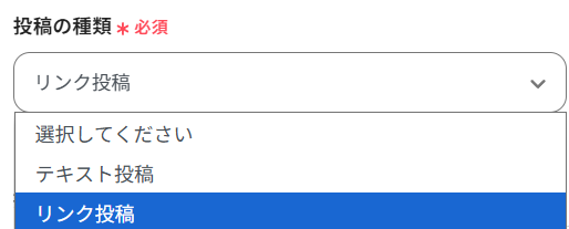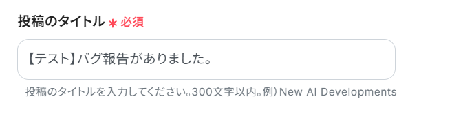 次に「投稿のタイトル」は、手入力による固定値や取得した値から活用できる情報などを設定してください。