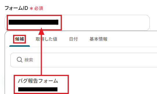 「フォームID」には、アプリトリガーで設定したJotformの該当フォームを候補から選択しましょう。