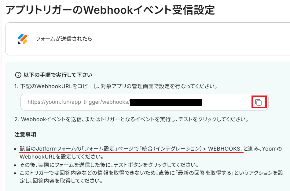 Yoomの設定画面に表示されるWebhookURLをコピーして、Jotformで使うフォームの設定画面でペーストしてください。