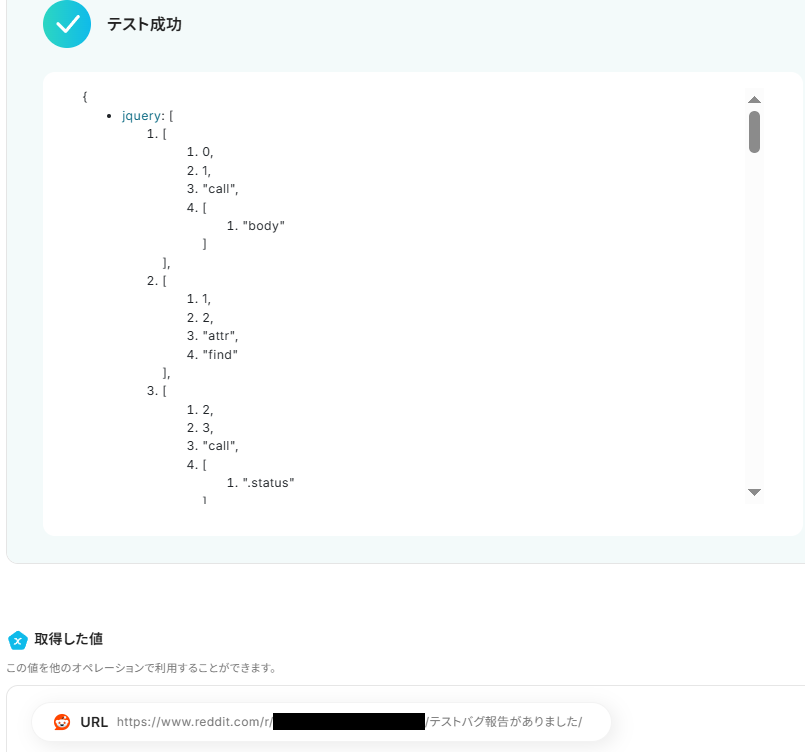 Redditの新規投稿オペレーションにて、「投稿の種類」を「リンク投稿」に設定し、投稿の本文にURLを含む取得した値を設定してください。