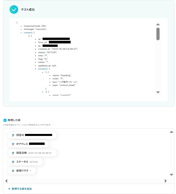 また、取得した値に必要なフォームの回答内容が表示されていない場合は、以下のヘルプページを参考に「+取得する値を追加」ボタンで増やしておきましょう。