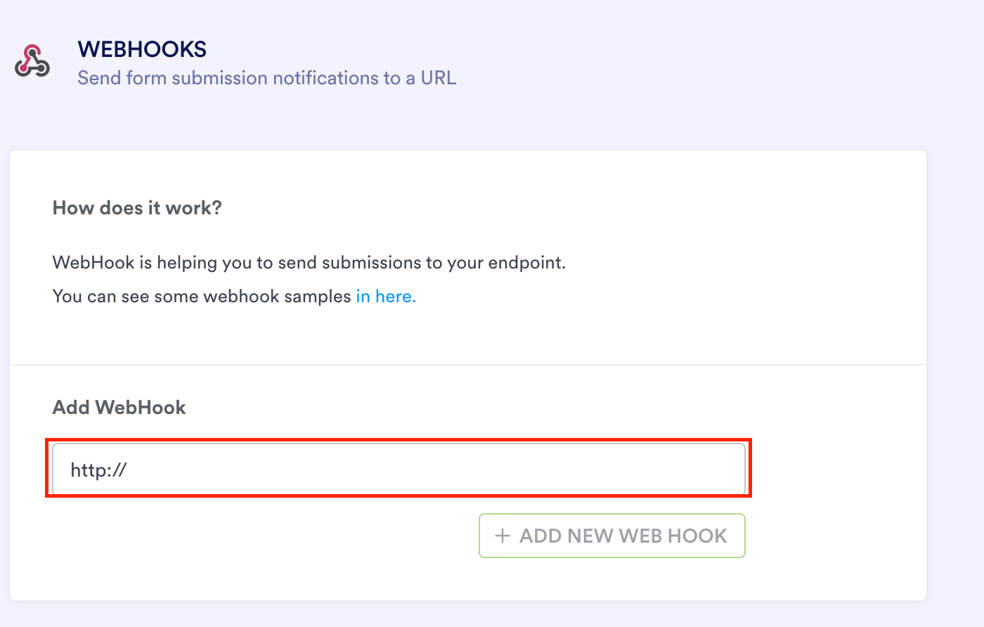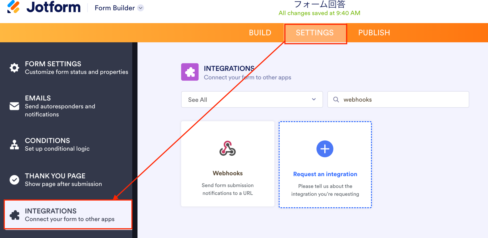 連携するフォームにアクセスし、設定の画面の設定から「SETTINGS」→「INTEGRATIONS」の順で進み、Webhookをクリックしてください。