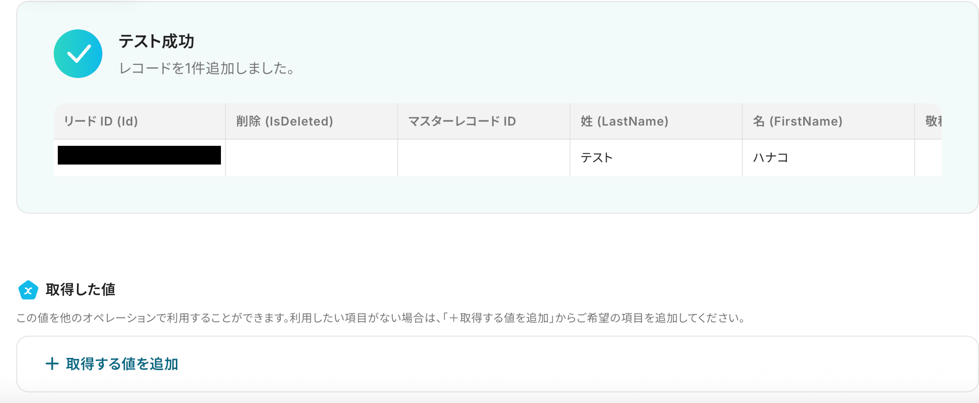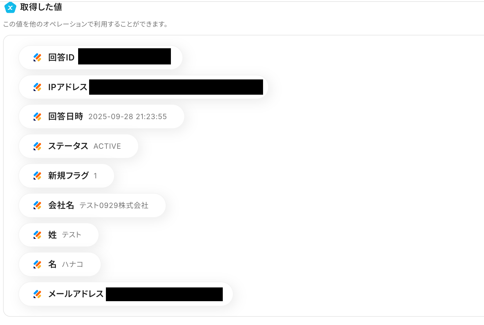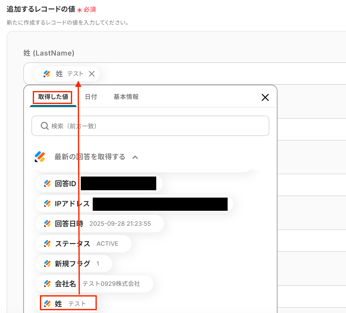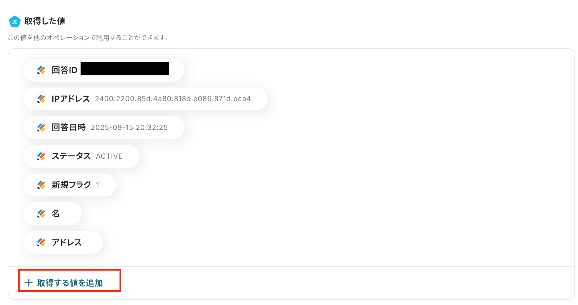 本来テストが成功すると取得した値に情報が追加されるのですが、「取得した値を追加」からJotformは手動で追加する必要があります。