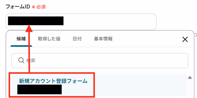 編集欄をクリックすると、連携したJotformアカウントのフォーム候補が表示されます。