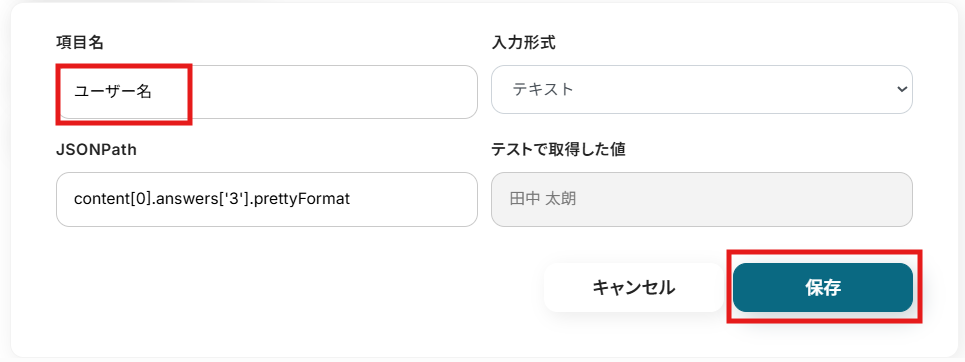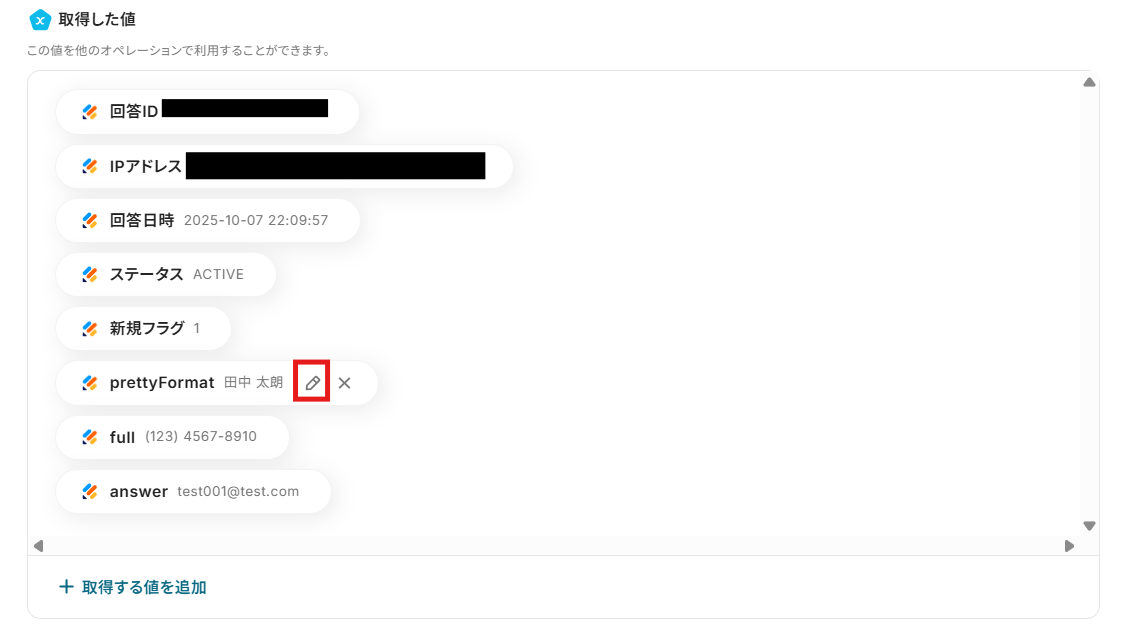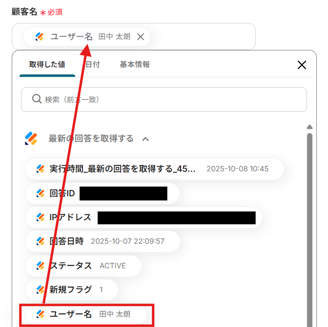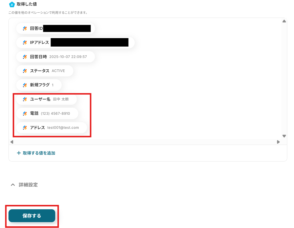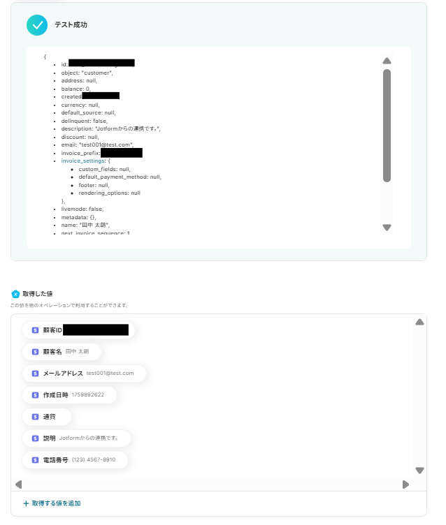 - 最後に、オペレーションでStripeの「顧客を作成」アクションを設定し、取得した回答内容をもとに顧客情報を作成します。