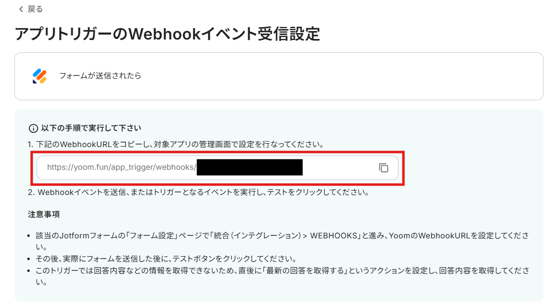 - JotformのWebhook設定方法はこちらをご参照ください。