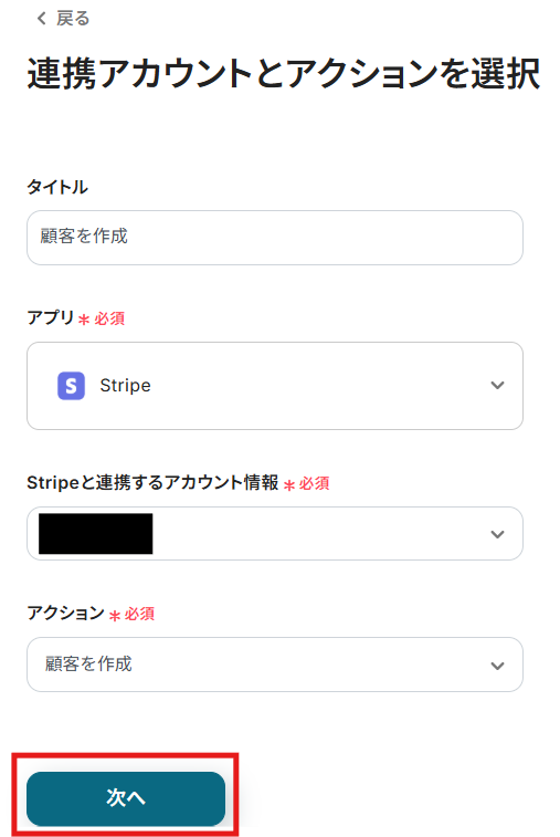 - 最後に、オペレーションでStripeの「顧客を作成」アクションを設定し、フォームの回答内容を元に顧客情報を作成します