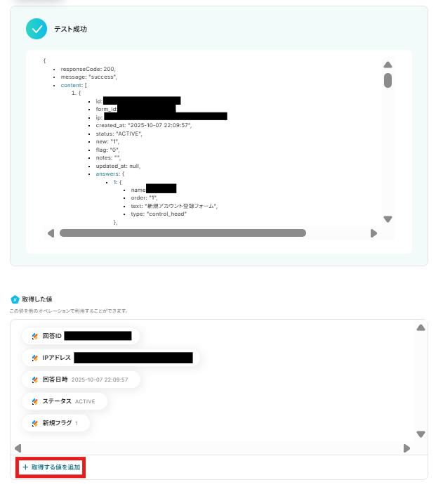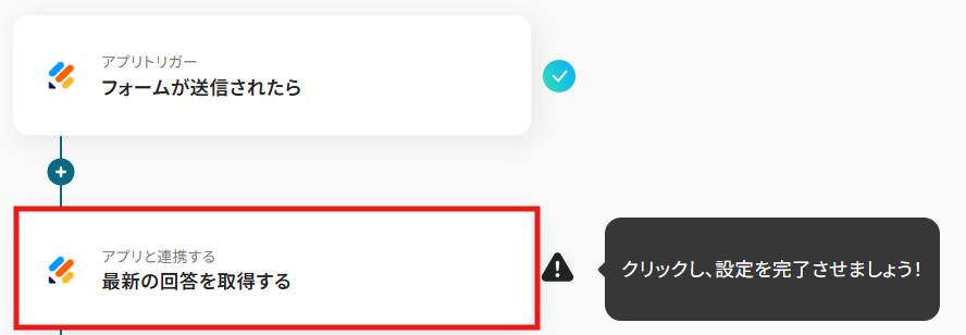 - 続けて、オペレーションでJotformの「最新の回答を取得する」アクションを設定し、送信されたフォームの内容を取得します
